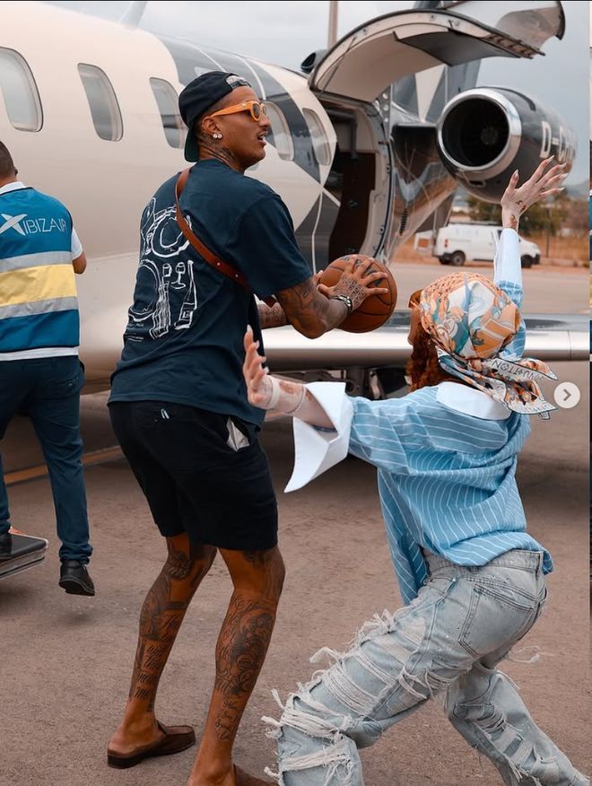 两人一起乘坐飞机前,还要打会儿篮球,秀恩爱。