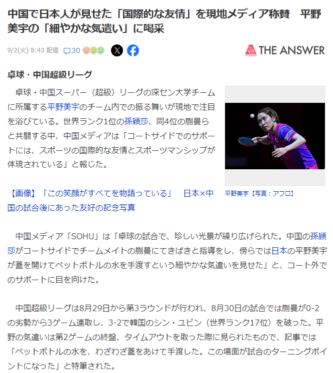 日媒称赞平野美宇征战乒超充满团队精神 暖心举动助力蒯曼大逆转